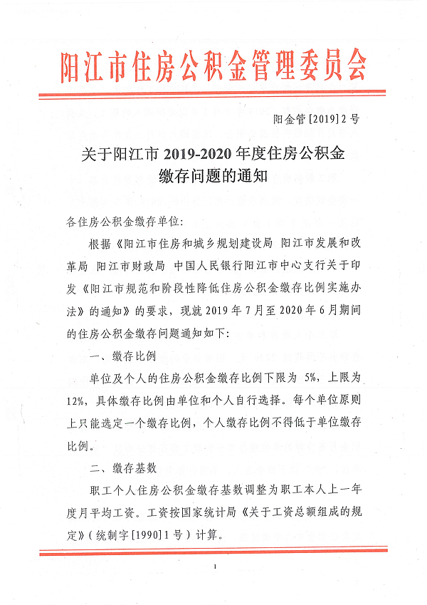 關(guān)于陽江市2019-2020年度住房公積金繳存問題的通知