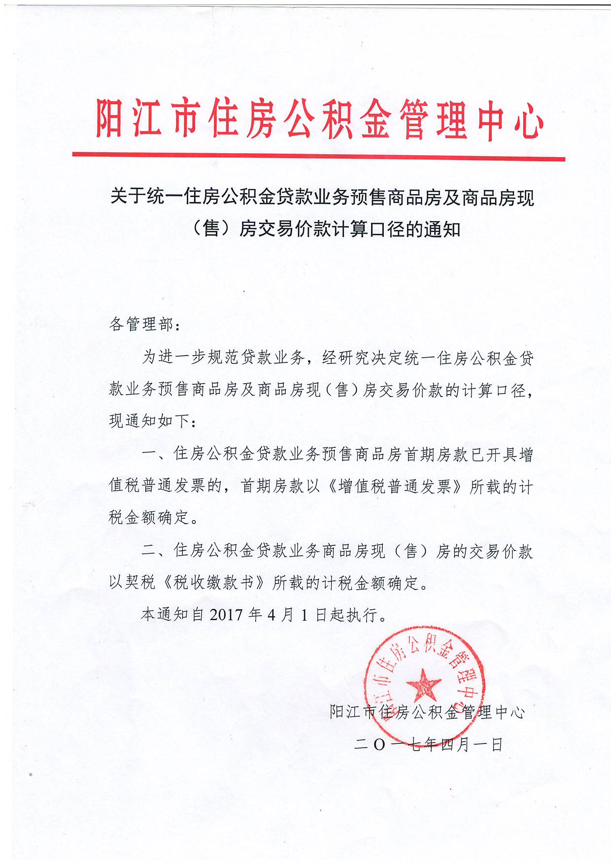 關(guān)于統(tǒng)一住房公積金貸款業(yè)務(wù)預(yù)售商品房及商品房現(xiàn)(售)房交易價(jià)款計(jì)算口徑的通知